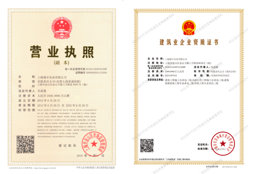 上海强丰实业有限公司成立于2012年,是强丰集团公司旗下以建筑工程建设、乡村环保新能源工程建设、交通运输、农副产品生产、配送、销售于一体的综合型业务公司。公司拥有一大批经验丰富的工程技术精英和管理人才,同时还拥有各类不同专业不同级别的技术骨干近百人。是金山区建筑联合协会会员单位,公司有中高级设计施工人员和专业施工队伍,具有市建交委颁发的建筑业企业资质证书和安全生产许可证,建筑装修装饰工程专业承包二级、建筑工程施工总承包三级、市政公用工程施工总承包三级、环保工程专业承包三级。公司先后与教育、医疗卫生机构、企事业单位、房地产企业等密切合作,完成了近千项建筑工程、工业厂房、公共建筑、市政公用设施等施工项目,工程合格率100%,其中新能源沼⽓环保项目的工程设计和施工,也是公司一个新亮点,目前承揽环保项目的工程设计和施工,有多个项目通过验收合格并投入使用。